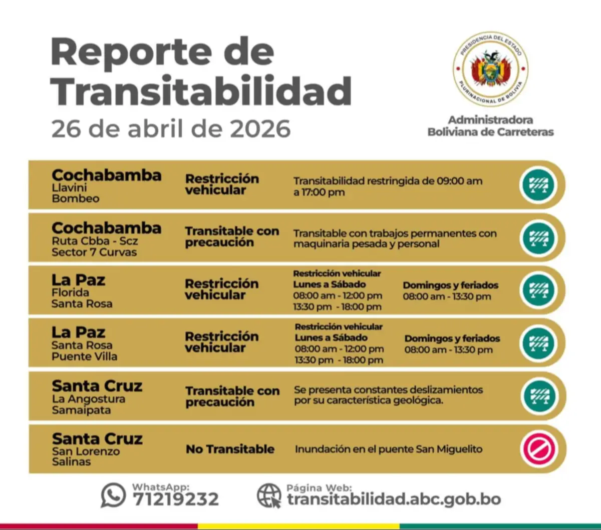 La Administradora Boliviana de Carreteras (ABC) emitió su más reciente reporte de transitabilidad para la Red Vial Fundamental, destacando cierres totales en Santa Cruz y diversas restricciones por trabajos y factores climáticos en Cochabamba, La Paz y Pando.