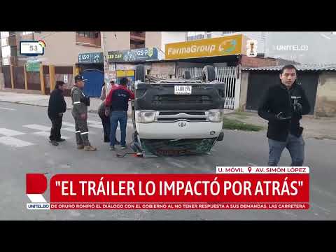 Un aparatoso accidente de tránsito se registró durante las primeras horas de este martes en la zona noroeste de la ciudad de Cochabamba, luego de que un minibús fuera impactado por un tráiler provocando que este vuelque y deje a su conductor herido.