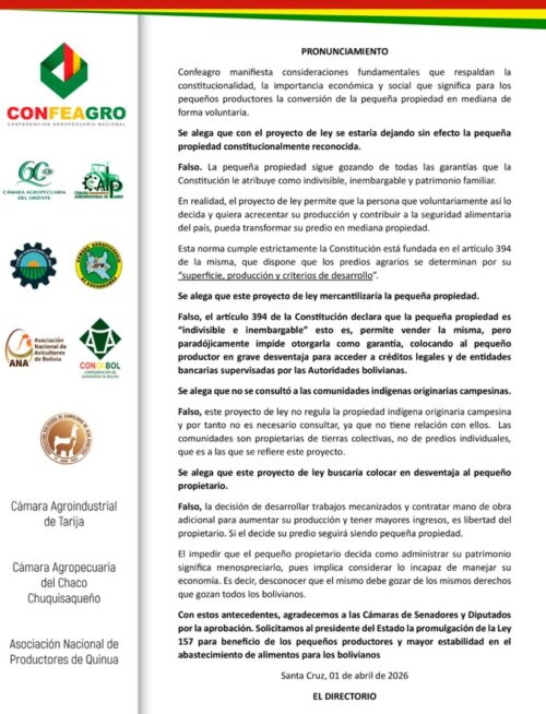 Según Confeagro, el proyecto de ley se fundamenta en el artículo 394 de la Constitución Política del Estado, que establece que los predios agrarios se definen en función de su superficie, producción y criterios de desarrollo. En ese marco, la norma habilita a los productores que así lo decidan a ampliar su escala productiva, con el objetivo de incrementar su rendimiento y contribuir al abastecimiento de alimentos.