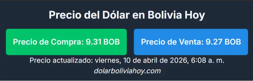 De acuerdo con el portal dolarboliviahoy.com, la divisa se ubica en Bs 9,31 para la compra y Bs 9,27 para la venta, lo que refleja un ajuste al alza respecto a la jornada anterior.