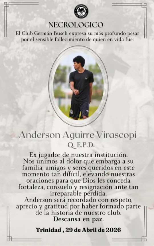El fútbol beniano atraviesa horas de dolor tras confirmarse el fallecimiento de Anderson Aguirre Virascopi, joven deportista que se destacó por su talento, disciplina y compromiso dentro del campo de juego.