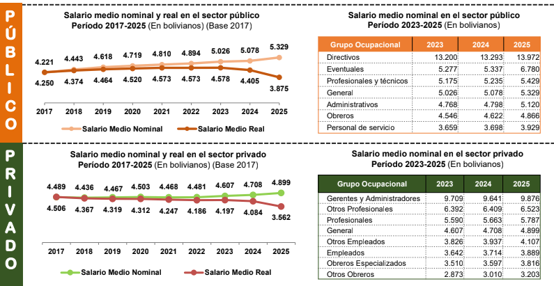 Los datos del IBCE muestran que, por ejemplo, en el sector privado un directivo ganaba en promedio en 2025 un salario de Bs 13.972; mientras que en el sector privado gerentes y administradoras percibían salarios de Bs 9.876 promedio.