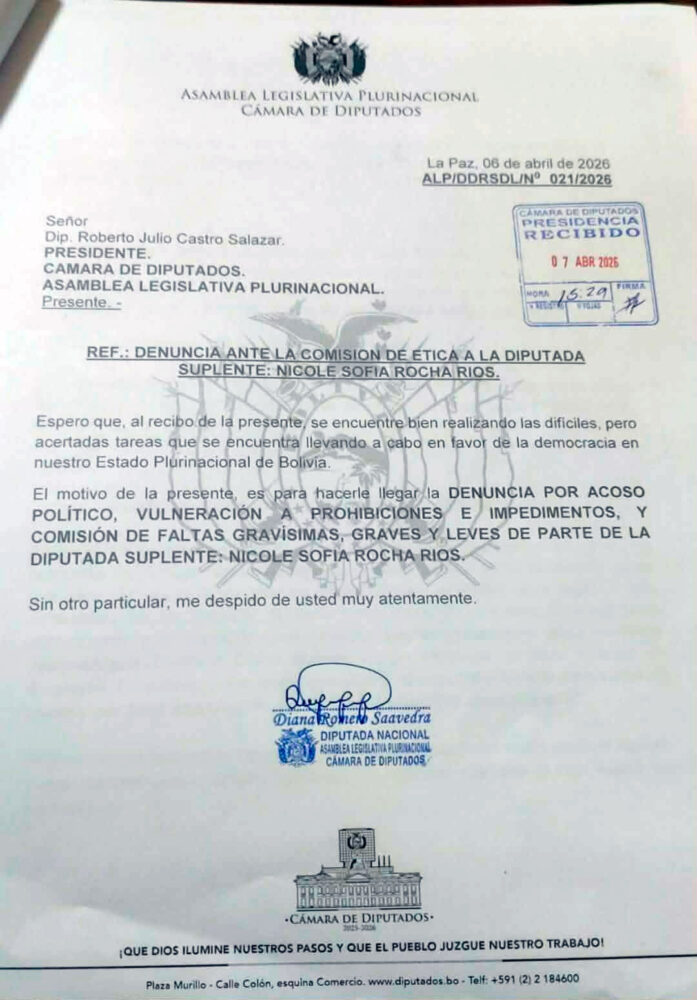 “Personalmente no conozco a la Diputada Suplente Nicole Sofía Rocha Rojas, pero recibo de parte de ella constantes amenazas de hacerme quitar el curul, espacio político que me fue dado por la voluntad del pueblo cruceño con resultados de las elecciones democráticas del 17 de agosto de 2025, no entiendo su accionar en contra mía”, dice el memorial.