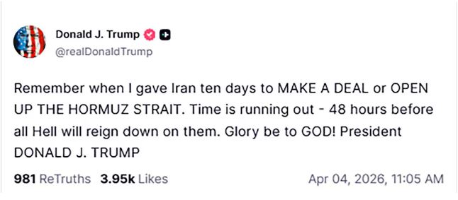 “¿Recuerdan cuando le di a Irán diez días para que LLEGARA A UN ACUERDO o ABRIERA EL ESTRECHO DE ORMUZ? El tiempo se acaba: 48 horas antes de que el infierno se apodere de ellos. ¡Gloria a Dios!“, manifestó en su cuenta en la red social Truth.
