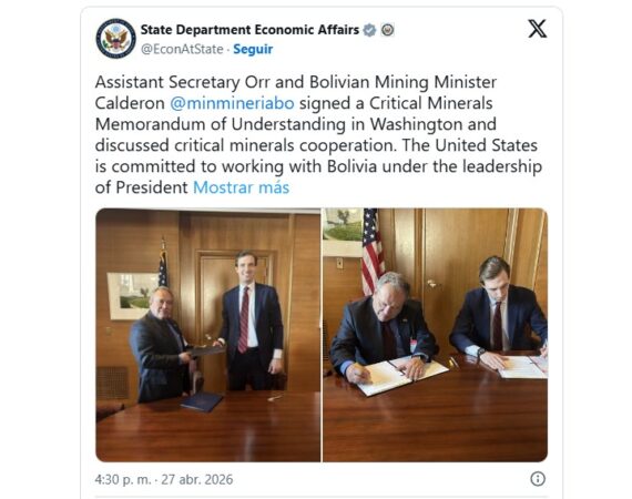 «Estados Unidos se compromete a colaborar con Bolivia, bajo el liderazgo del presidente (Rodrigo) Paz, para atraer inversiones que impulsen la prosperidad» en ambos países y «garanticen la seguridad de las cadenas de suministro de minerales críticos», indicó la Subsecretaría en su mensaje en X.