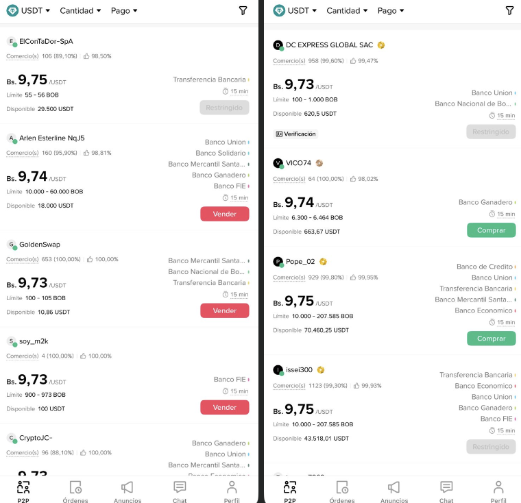 Este viernes, el dólar virtual en la plataforma Binance, tanto para la compra como para la venta, estaba entre 9,73 y 9,75 bolivianos.