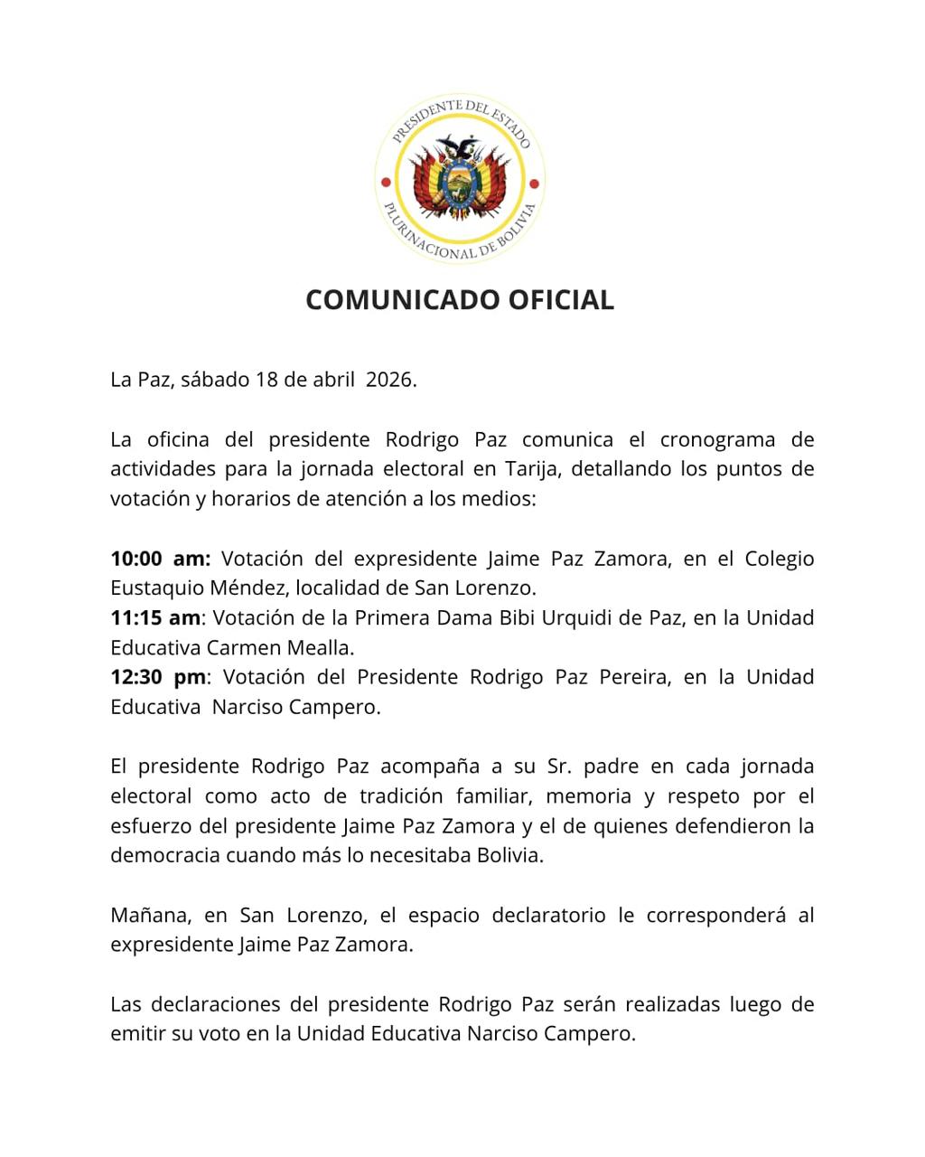 La oficina de Rodrigo Paz Pereira difundió un comunicado oficial con el cronograma de actividades para la jornada electoral en Tarija, en el que se especifican los horarios y lugares de votación tanto del primer mandatario, así como de su padre, el expresidente Jaime Paz Zamora (1989 – 1993) y de la primera dama, Bibi Urquidi.