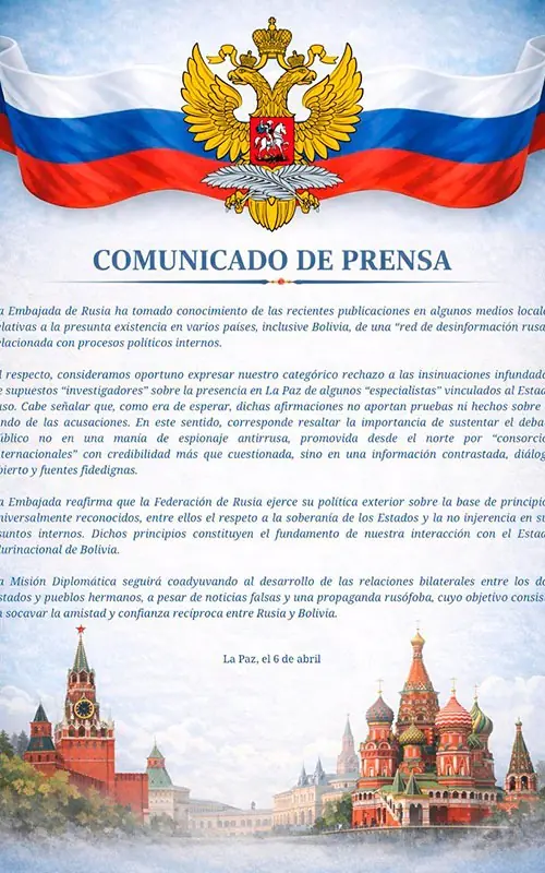 La Embajada de Rusia en Bolivia emitió este lunes un comunicado en el que rechaza “categóricamente” las versiones sobre la supuesta existencia de una red de desinformación rusa que habría operado en el país.