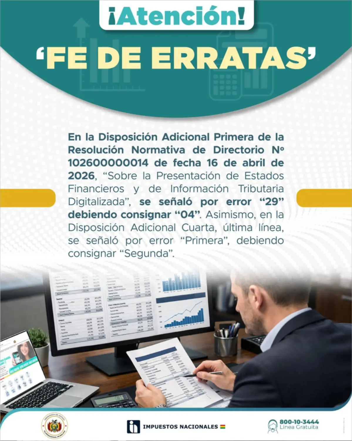 El Servicio de Impuestos Nacionales (SIN), a través de su plataforma de cultura tributaria, comunicó la emisión de una fe de erratas a la Resolución Normativa de Directorio (RND) Nº 102600000014, ajustando errores en el documento publicado el pasado 17 de abril de 2026.