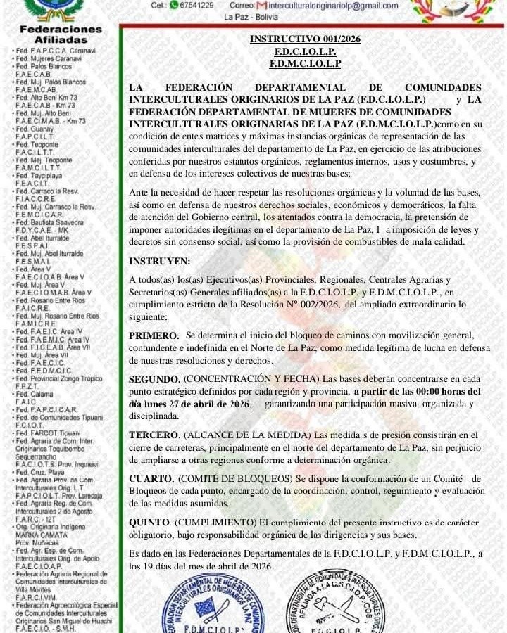 La Federación Departamental de Comunidades Interculturales Originarias de La Paz y la Federación de Mujeres de Comunidades Interculturales Originarias, ambas organizaciones del norte paceño, anunciaron el inicio de un bloqueo indefinido de caminos desde las 00:00 del lunes 27 de abril.