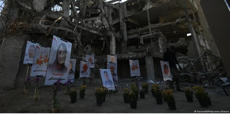 Rostros de víctimas civiles iraníes, junto a edificios destruidos por los bombardeos israelíes y estadounidenses en Teherán. (Archivo: 09.04.2026)Imagen: Farnood/SIPA/picture alliance
