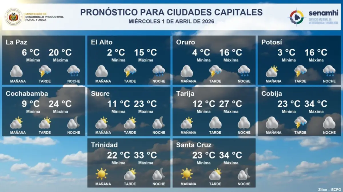 El Servicio Nacional de Meteorología e Hidrología (Senamhi) informó que este miércoles 1 de abril se registrarán tormentas eléctricas en varias regiones de Bolivia, principalmente en el occidente del país, con probabilidad de lluvias.