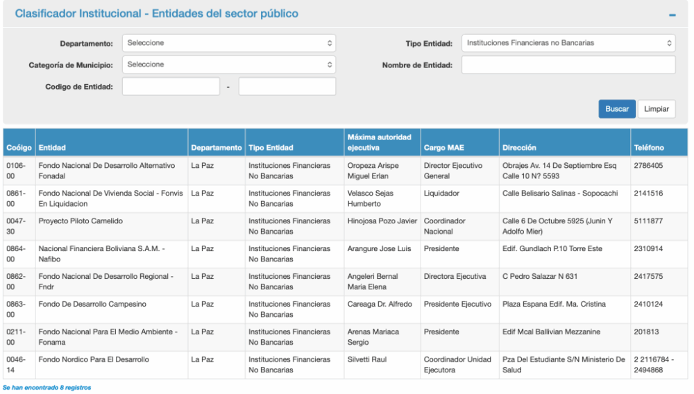 Son 8 las instituciones financieras no bancarias, 37 entidades públicas conforman el Órgano Judicial, 77 entidades son dependientes de los Ministerios, 13 universidades públicas, 2 gobiernos autónomos indígena originario campesinos y 360 entidades públicas clasificadas como «otras».