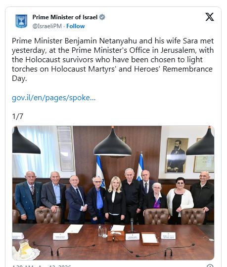 El primer ministro de Israel, Benjamín Netanyahu, se reunió con supervivientes del Holocausto en su oficina en Jerusalén el domingo, con motivo del Día del Recuerdo que se celebra este lunes y martes (13 y 14 de abril), y aseguró que Israel está «dando caza a los opresores» en el marco de la escalada regional.