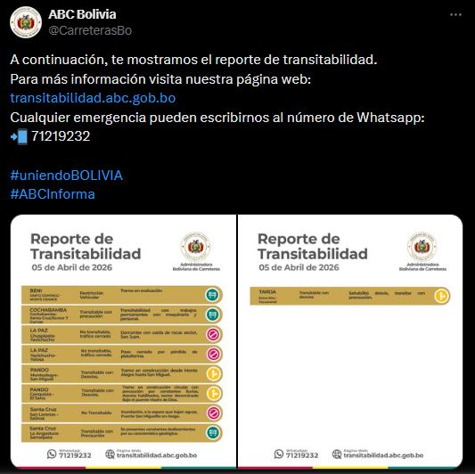 La Administradora Boliviana de Carreteras (ABC) emitió un informe sobre la transitabilidad en las carreteras en el país