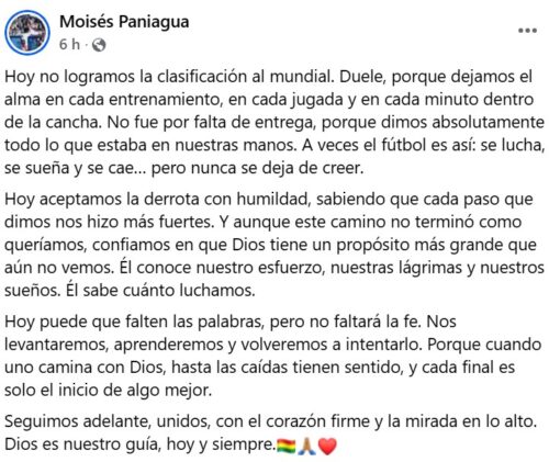 Luego de la derrota de Bolivia ante Irak, el goleador de la Selección nacional Moisés Paniagua se pronunció a través de sus redes para afirmar que, pese a la caída, nunca se debe dejar de creer.