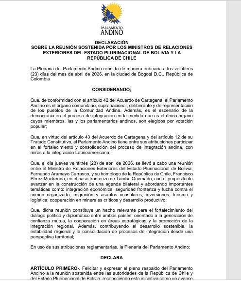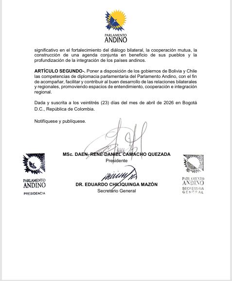 En la Plenaria del Parlamento Andino desarrollada en Bogotá, Colombia, los parlamentarios bolivianos MSc. DAEN René Daniel Camacho, presidente de este organismo, Mario Herrera Sánchez, Bastián Giesse Rougcher, Daniel Marañón Tovar y Bladimir Choque Lazaro impulsaron una declaración que respalda el diálogo e integración entre Bolivia y Chile.