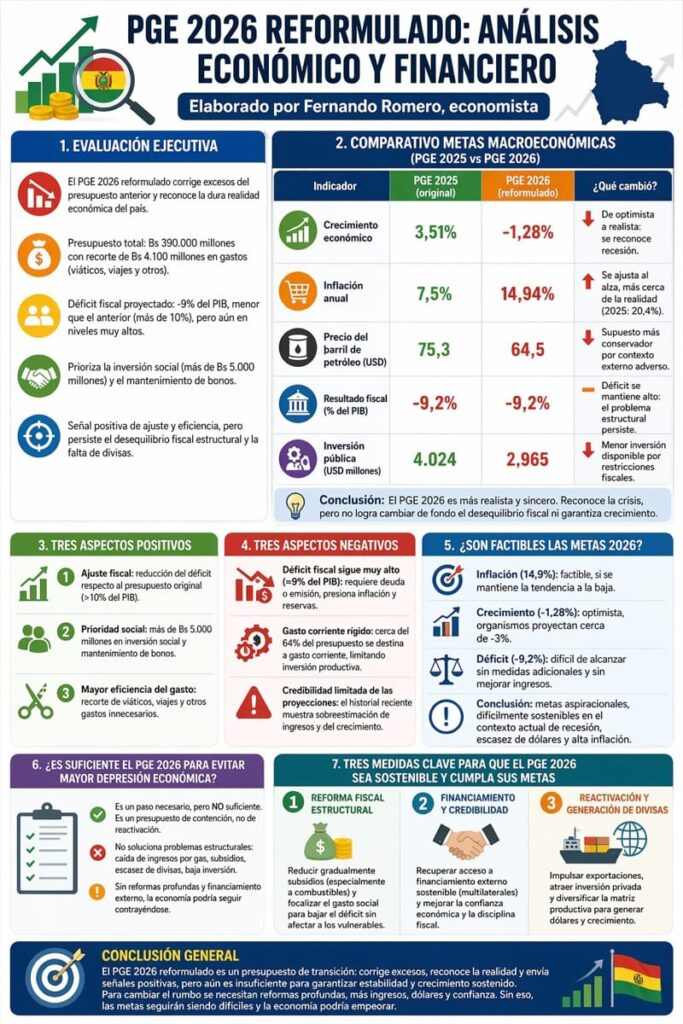 En síntesis, el PGE 2026 reformulado refleja un giro hacia un enfoque más realista y prudente frente a la compleja situación económica de Bolivia, corrigiendo el exceso de optimismo del presupuesto 2025, pero sin resolver los problemas estructurales de fondo. Si bien incorpora señales positivas como la reducción del déficit, el recorte de gastos innecesarios y la protección del gasto social, mantiene desequilibrios importantes, especialmente un déficit fiscal elevado y una fuerte dependencia de financiamiento. Las metas macroeconómicas son más coherentes con la realidad reciente, pero aún enfrentan riesgos significativos de incumplimiento debido a la recesión, la inflación persistente y la escasez de divisas. En este contexto, el presupuesto actúa más como un instrumento de contención que de reactivación, lo que limita su capacidad para revertir la caída económica proyectada por organismos internacionales. Para que sea sostenible, se requieren reformas más profundas en subsidios, ingresos fiscales y generación de divisas, además de recuperar la confianza de inversionistas y acreedores.