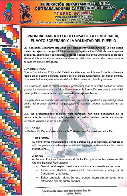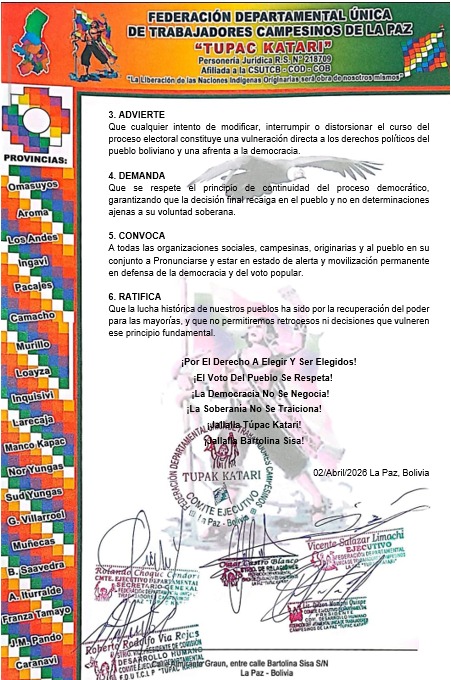 En su pronunciamiento, la federación campesina expresa su preocupación ante lo que califica como una “pretendida alteración del curso democrático” y exige a las instancias electorales actuar con transparencia y apego a la Constitución. “La Federación Departamental Única de Trabajadores Campesinos de La Paz Túpac Katari, en ejercicio de su rol histórico como organización matriz de las mayorías populares, originarias y campesinas, ante los hechos recientes vinculados al proceso electoral subnacional y la pretendida alteración del curso democrático, se pronuncia de manera firme y categórica”, señala el documento.