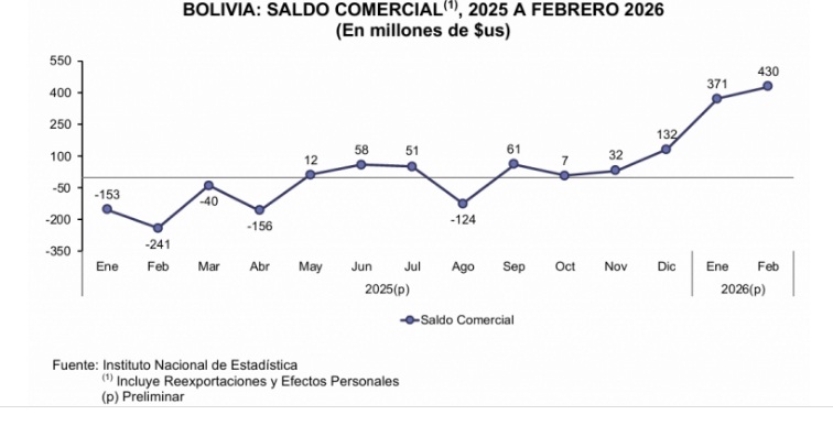 El comercio exterior de Bolivia registró, por segundo mes consecutivo, un superávit comercial llegando a $us 430 millones en febrero, impulsado principalmente por el aumento de las exportaciones de minerales, informó el Instituto Nacional de Estadística (INE).