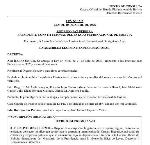 El presidente de Bolivia, Rodrigo Paz, promulgó la Ley 1717, que elimina el Impuesto a las Transacciones Financieras (ITF), una medida que impacta directamente en la economía de la población.