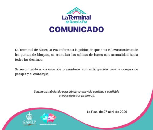 La administración de la terminal informó, mediante un comunicado, que las operaciones se restablecieron tras confirmarse la libre transitabilidad en las carreteras, especialmente en la vía que conecta La Paz con Oruro. Asimismo, recomendó a los usuarios presentarse con anticipación para la compra de pasajes y el embarque, además de mantenerse informados a través de canales oficiales.