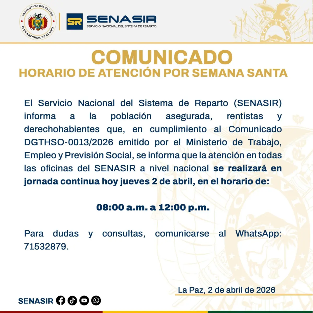 El Servicio Nacional del Sistema de Reparto (Senasir) informó que ajustará sus horarios de atención debido al feriado de Semana Santa.