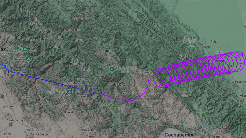 El portal Flightradar24.com, que expone en tiempo real los recorridos, da cuenta que la aeronave comenzó a registrar un vuelo circular cuando ingresó a espacio aéreo de Cochabamba.