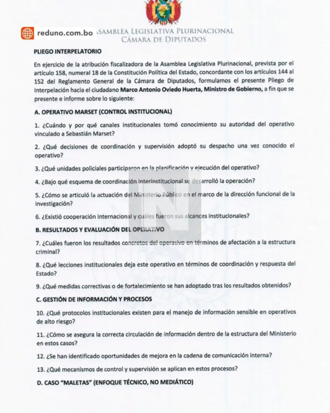 El pliego interpelatorio está conformado por 25 preguntas que el ministro deberá responder ante senadores y diputados. Estas abarcan temas como el caso Marset, resultados de operativos, manejo de información y procesos, además de investigaciones vinculadas a maletas, avionetas, lucha contra la corrupción policial y cooperación internacional.