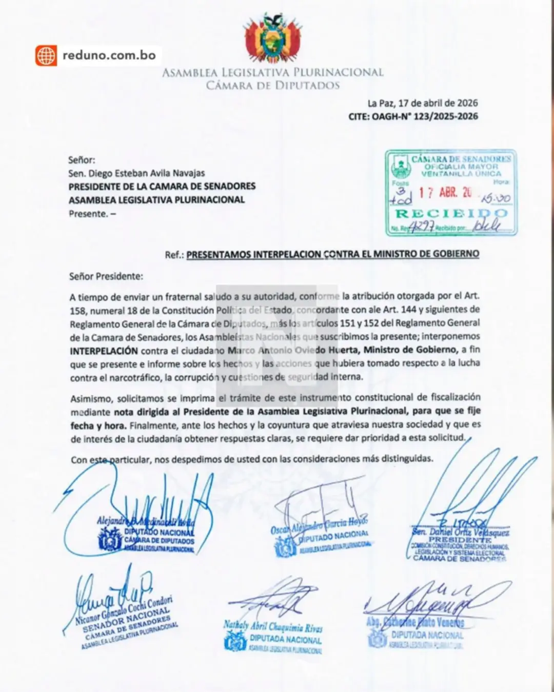 La nota, recibida oficialmente el 17 de abril de 2026 , lleva las firmas de legisladores como Alejandro Medinaceli, Oscar Alejandro García, el senador Daniel Ortiz (Presidente de la Comisión de Constitución) y Nicanor Gonzalo Cochi, entre otros.