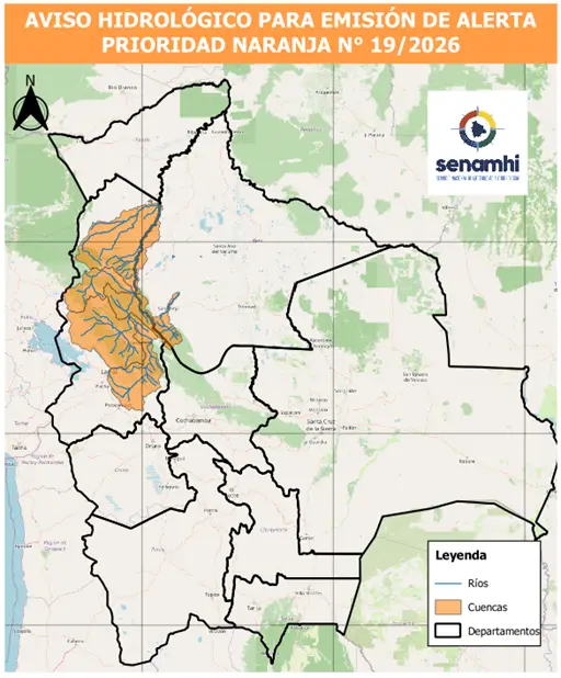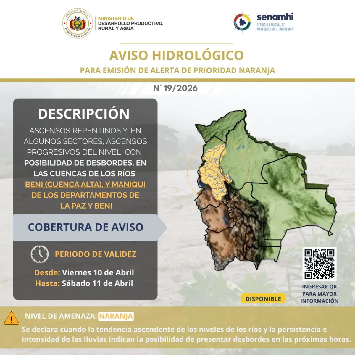 El Servicio Nacional de Meteorología e Hidrología (Senamhi) activó el Aviso Hidrológico de Alerta Naranja N° 19/26, ante la amenaza inminente de desbordes de ríos debido a las intensas lluvias. La medida rige desde el 10 hasta el 11 de abril de 2026, afectando principalmente a las cuencas de los ríos Beni (cuenca alta) y Maniqui.