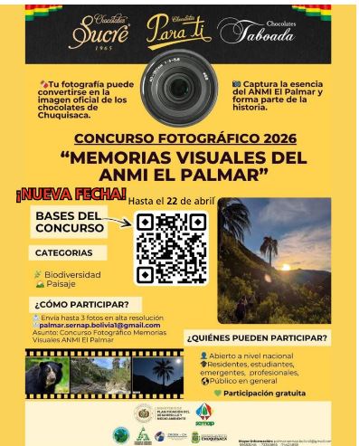 Con el objetivo de permitir una mayor participación de fotógrafos y aficionados de todo el país, el Servicio Nacional de Áreas Protegidas (SERNAP), a través del Área Natural de Manejo Integrado (ANMI) El Palmar, anuncia la ampliación del plazo de recepción de fotografías hasta el 22 de abril de 2026.