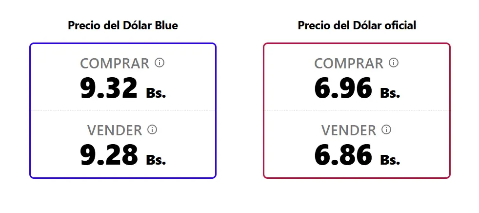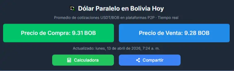 Por su parte, el sitio bolivianblue.net, que actualiza sus datos cada 15 minutos, reporta que la divisa se ubica en Bs 9,32 para la compra y Bs 9,28 para la venta. En su registro del cierre del domingo, el portal señalaba Bs 9,32 para la compra y Bs 9,29 para la venta, lo que muestra un ligero descenso en la cotización de venta.