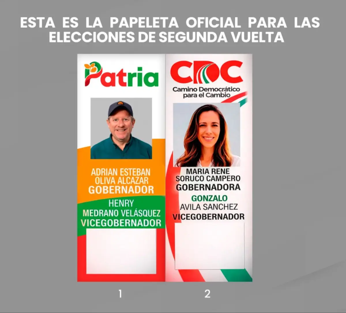 Como resultado, la agrupación Patria, que postula a Adrián Esteban Oliva, ocupará una de las franjas de la papeleta, mientras que la agrupación Camino Democrático para el Cambio (CDC), con la candidata María René Soruco, estará en la otra.