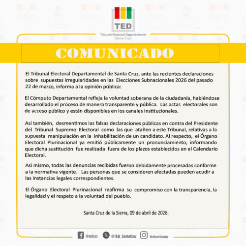 El TED también desmiente versiones que apuntan a una «supuesta manipulación» en la inhabilitación de un candidato, aclarando que el Órgano Electoral Plurinacional (OEP) ya se pronunció sobre este caso y estableció que la sustitución se realizó fuera de los plazos fijados en el calendario electoral.