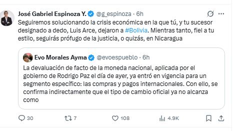 Un tenso cruce protagonizaron en las redes sociales el expresidente Evo Morales y el ministro de Economía y Finanzas Públicas, José Gabriel Espinoza, en el marco de la nueva disposición del Gobierno de liberar el uso de las tarjetas de crédito y débito, afectadas en su momento por la falta de dólares.