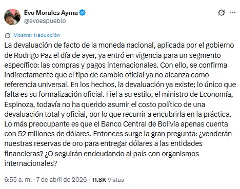 Para Morales, esta medida implica una “devaluación de facto de la moneda nacional”. En ese contexto, apuntó al ministro Espinoza.