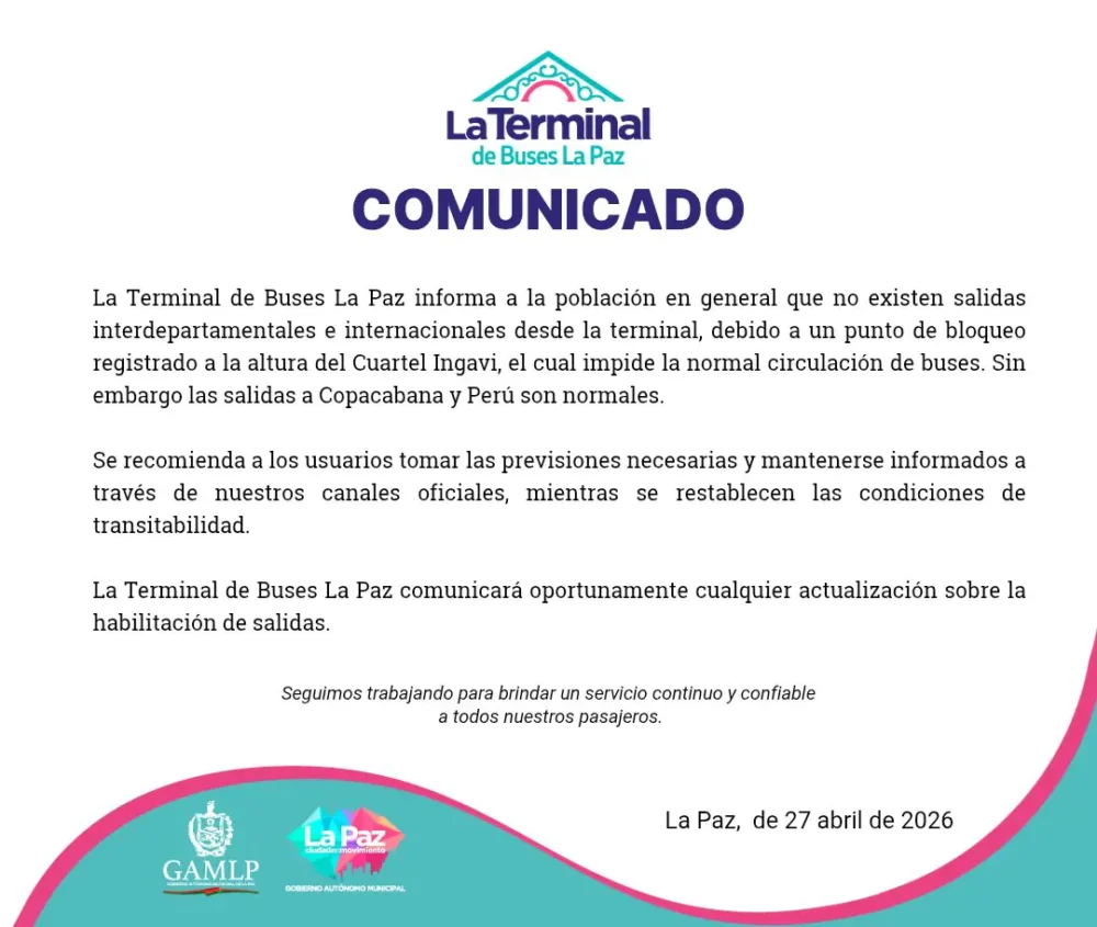 Mediante un comunicado en sus rede sociales, la entidad informó que un punto de bloqueo a la altura del Cuartel Ingavi impide la circulación de buses. Sin embargo, también indicó que las salidas hacia Perú y Copacabana son normales.