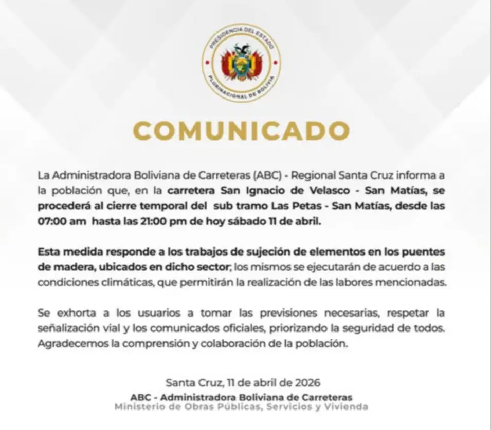 La Administradora Boliviana de Carreteras (ABC) informó el cierre temporal del tramo Las Petas–San Matías, en la carretera San Ignacio de Velasco–San Matías, este sábado 11 de abril en el departamento de Santa Cruz.
