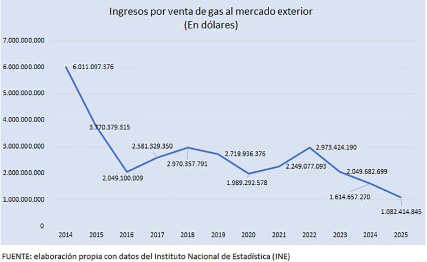 En 2014, el país recibió más de 6.000 millones de dólares y la producción bordeaba los 60 millones de metros cúbicos día (MMmcd), pero el 2025 los ingresos cayeron y la producción a menos de 30 MMmcd.
