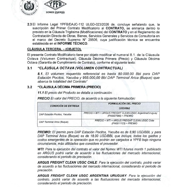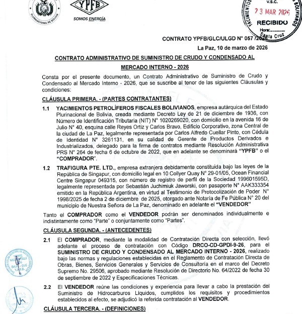 Contrato administrativo entre YPFB y Trafigura. Foto: ANF