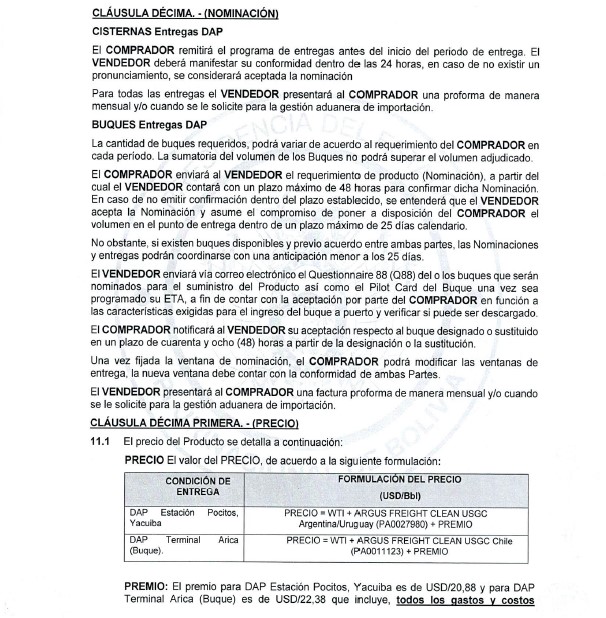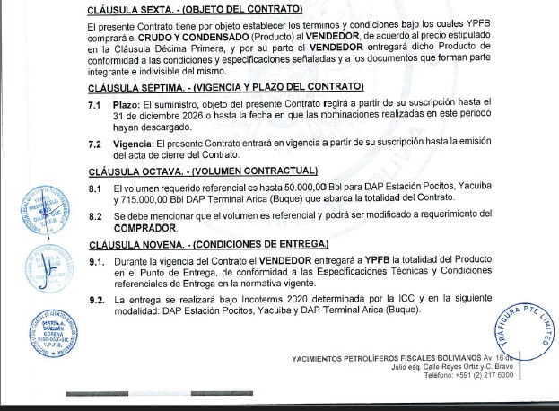 “El presente contrato tiene por objeto establecer los términos y condiciones bajo los cuales YPFB comprará el crudo y condensado al vendedor (Trafigura PTE LTD), de acuerdo al precio estipulado en la clausula decima primera, y por su parte, el vendedor entregará dicho producto de conformidad a las condiciones y especificaciones señaladas y a los documentos que forman parte integrante e indivisible del mismo”, señala la clausula sexta del documento.