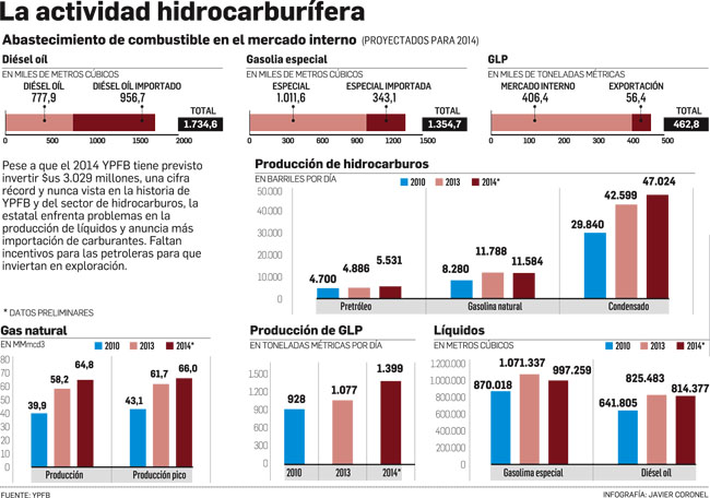 Bolivia seguirá importando diésel y gasolina en 2014. La estatal petrolera YPFB admitió ayer que, pese al repunte en la producción de gas natural, el país tiene problemas en el abastecimiento principalmente de diésel y en menor proporción de gasolina especial.