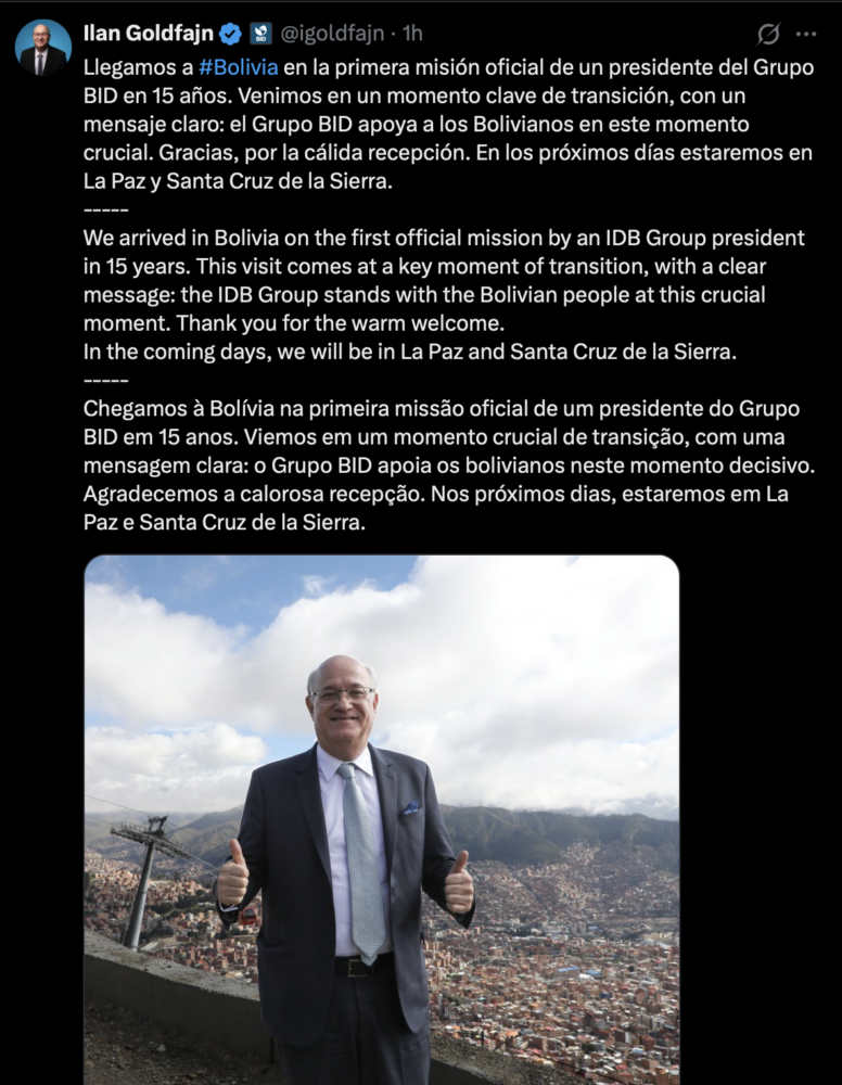 El presidente del Banco Interamericano de Desarrollo (BID), Ilan Goldfajn, afirmó a través de su cuenta en X que llega a Bolivia en un momento clave de transición y con un mensaje claro: “el Grupo BID apoya a los bolivianos en este momento crucial”.