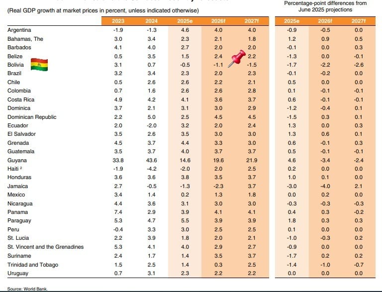 El BM ratifica que BOLIVIA esta en recesión, según sus datos el 2025 se estima que nuestra economía decreció en 0,5%. Sus proyecciones para el 2026 y 2027 indican que la tendencia continua, con un -1,1% y -1,5% respectivamente. De acuerdo a este organismo, seremos el 2do país en recesión para este 2026, después de Jamaica (-2,3%).