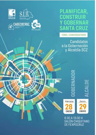 La Cámara de la Construcción de Santa Cruz (CADECOCRUZ), El Colegio de Arquitectos de Santa Cruz (CASCZ), la Sociedad de Ingenieros de Bolivia – Departamental Santa Cruz (SIB), y el Comité Consultivo Técnico Departamental (CCTD) anunciaron la realización del Foro Conversatorio “Planificar, construir y gobernar Santa Cruz”, que se llevará a cabo el miércoles 28 y jueves 29 de enero, de 8:30 a 13:00 horas, en el Salón Chiquitano de Fexpocruz.
