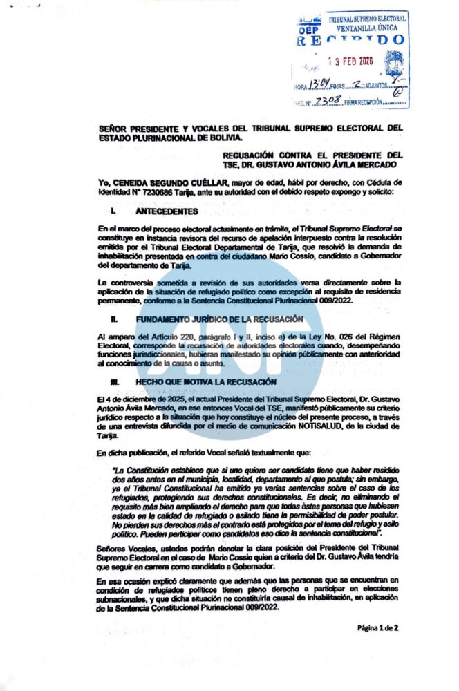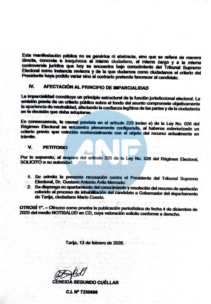 “Por lo expuesto, al amparo del artículo 220 de la Ley 026 del Régimen Electoral, solicito a su autoridad: 1) se admita la presente recusación contra el Presidente del Tribunal Supremo Electoral, Gustavo Antonio Ávila Mercado. 2) Se disponga su apartamiento del conocimiento y resolución del recurso de apelación referido al proceso de inhabilitación del candidato a Gobernador del departamento de Tarija, Mario Cossio”, dice el petitorio de la recusante.