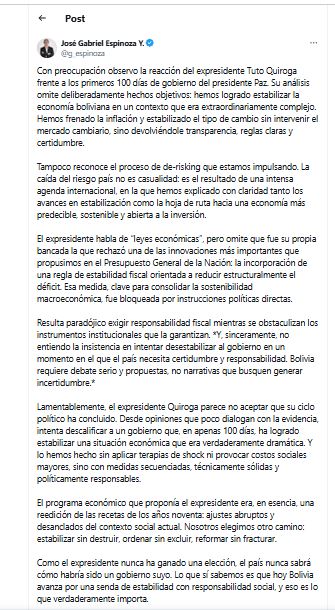 El ministro de Economía, Gabriel Espinoza, considera que el expresidente Tuto Quiroga propone «recetas de los noventa» y afirmó que su ciclo político «ha concluido».