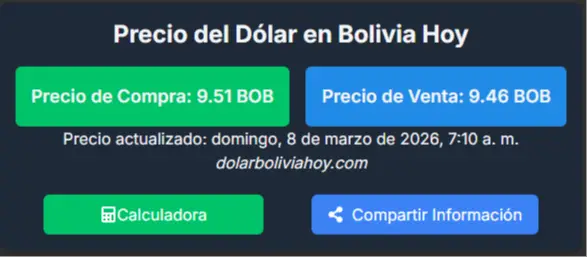 De acuerdo con el portal dolarboliviahoy.com, la moneda estadounidense se cotiza en Bs 9,51 para la compra y Bs 9,46 para la venta, lo que representa un aumento respecto al cierre de la jornada anterior.