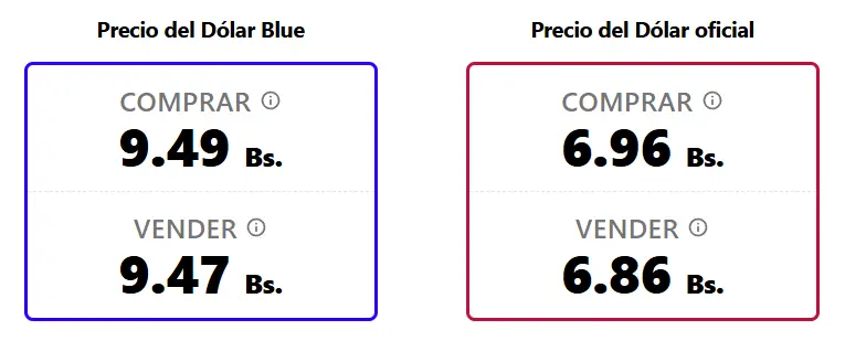 Según este portal, el dólar se ubica en Bs 9,49 para la compra y Bs 9,46 para la venta. Durante la jornada del sábado, el mismo sitio registraba una cotización de Bs 9,38 para la compra y Bs 9,35 para la venta.